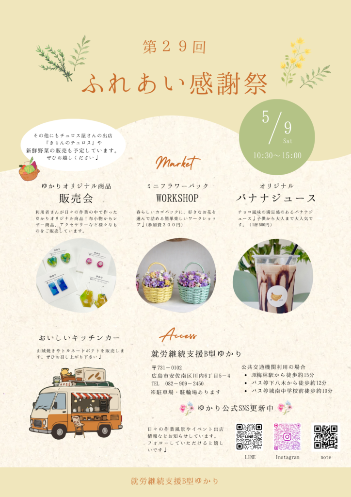 2026年3月30日 / 最終更新日時 : 2026年3月30日 yukari お知らせ 第29回ふれあい感謝祭 令和8年5月9日(土)今回は、地域の野菜やキッチンカーも出店しております。 皆様、お誘いあわせの上、是非、お越しください。 Bluesky コメントを残す コメントをキャンセルメールアドレスが公開されることはありません。 ※ が付いている欄は必須項目ですコメント ※ 名前 ※ メール ※ サイト 次回のコメントで使用するためブラウザーに自分の名前、メールアドレス、サイトを保存する。 上に表示された文字を入力してください。 Δ